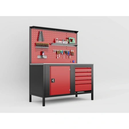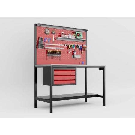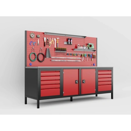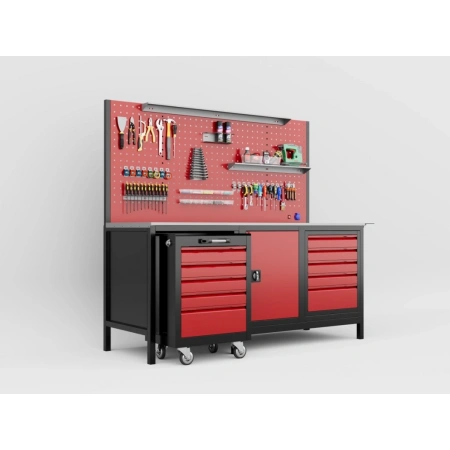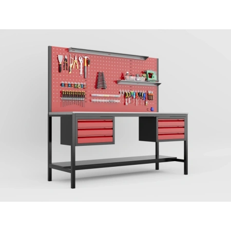 - Dev Delikli Pano (Perfore Panel): Tüm tezgah boyunca uzanan geniş perfore panoda, aletlerinizi dilediğiniz gibi düzenleyin. Ergonomik olarak en sık kullandığınız takımlara anında erişin. (Görseldeki kancalar ve askı aparatları dahildir/dahil değildir bilgisini belirtiniz.)